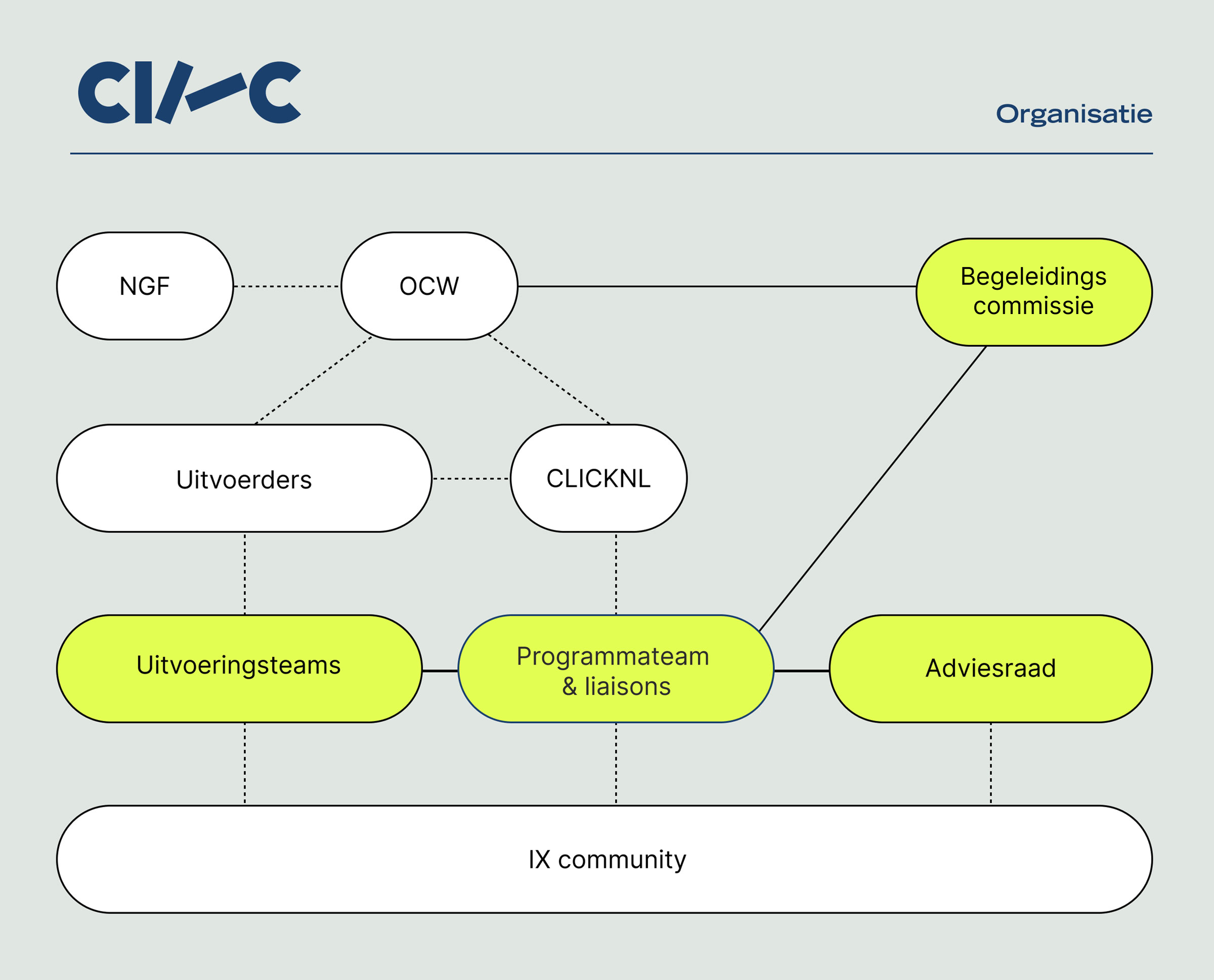 Naast het Programmateam en vier uitvoerders – waarvan een liaison ook in het Programmateam zit – is er de Begeleidingscommissie, de Adviesraad (met vertegenwoordigers vanuit de IX-community) en natuurlijk de community zelf.